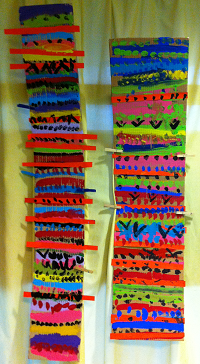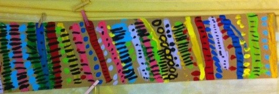 2 - Tes bandes peuvent se toucher ou être espacées… Laisse sécher puis décore chaque bande à la peinture noire (ou couleur de ton choix) en dessinant des formes simples : points, traits, ronds, carrés, étoiles, soleils etc…